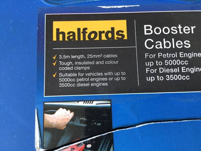 Halfords 25mm Booster Cables Brisk and simple to utilize, the Halfords 25mm Booster Cables are an arrangement of 3.5m links that are suitable for petrol and diesel motors. Halfords 25mm Booster Cables Extra Info: 3.5 meter link length for adaptable use Suitable for petrol and diesel motors up to 3.5L Shading coded protected braces for usability Suitable for use on Start/Stop batteries. 25mm link cross area